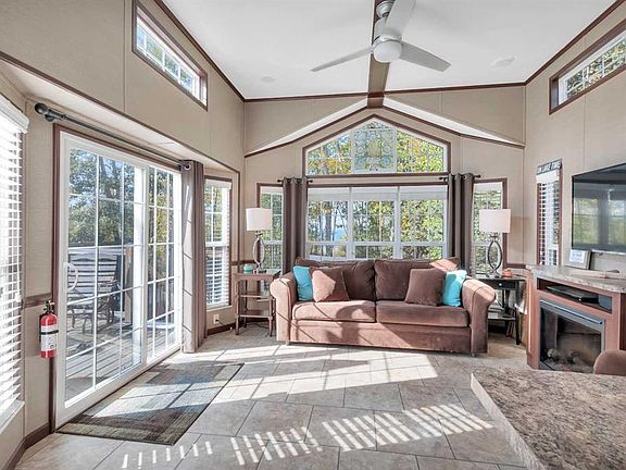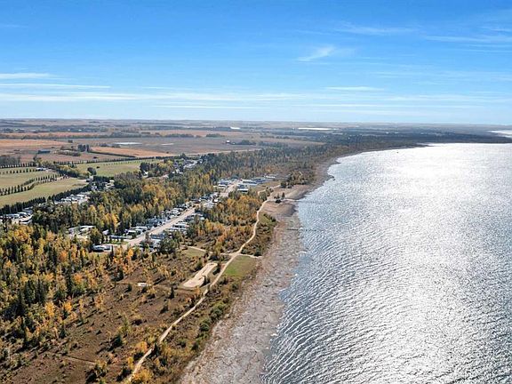 Visit REALTOR® website for additional information. This lakeside mobile home is located at DeGraff’s Resort, a 3-season gated community, offering 2 bedrooms, a 4 pc bathroom, A/C, a private yard & backs onto a treed area with direct access to a shared private beach. Step inside and be greeted by high ceilings, an open floor plan, and walls of windows that flood the home with natural light while framing peaceful views. The inviting main living area features a cozy electric fireplace with a mantel, built-in surround sound speakers, and direct access to a large deck—ideal for morning coffee or sunset gatherings. The kitchen is thoughtfully designed with natural wood cabinets, a breakfast bar, a pantry, and a gas range, making meal prep a pleasure. The primary bedroom offers generous built-in storage, and the second bedroom is designed with custom bunk beds. A full 4-piece bath and a stacked washer/dryer add comfort and everyday ease. Outside, enjoy a private yard with a fire pit and a beautiful walking path with direct access to the beach, four parking stalls, plus one extra parking spot in the RV parking area at the top of the hill, giving you plenty of room for lake toys. Have fun with family and friends while taking advantage of all the great amenities—basketball and pickleball courts, a huge playground, trampolines, and nature trails and hiking paths. For your comfort, there are also public washrooms and a shower house with laundry facilities. Whether unwinding indoors or soaking up the views outside, this lakeside property is the ticket to the resort lifestyle you’ve been dreaming of.