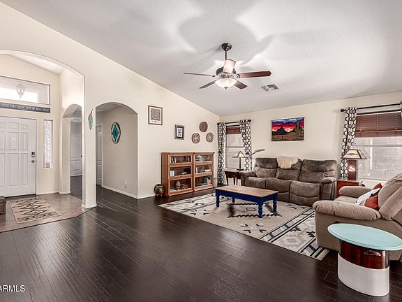 Just in time for summer, this beautiful 3 bed 2 bath property with a POOL is on the market! Enter to find an immaculate home with neutral paint, high vaulted ceilings, and lots of natural light. Adjacent to the spacious great room is an upgraded kitchen with granite counters, modern backsplash, stainless appliances, and a large island with pendant lighting and breakfast bar seating. The master bedroom is split for privacy, and both bathrooms have been remodeled. MOVE IN READY-- not only do you get the fridge, washer, and dryer, but in 2023 the sellers installed a new HVAC system, new water heater, new water softener, new R/O system, and a new pool pump. Low-maintenance landscape in the backyard so that you have plenty of time to relax on your covered patio or in the refreshing pool.