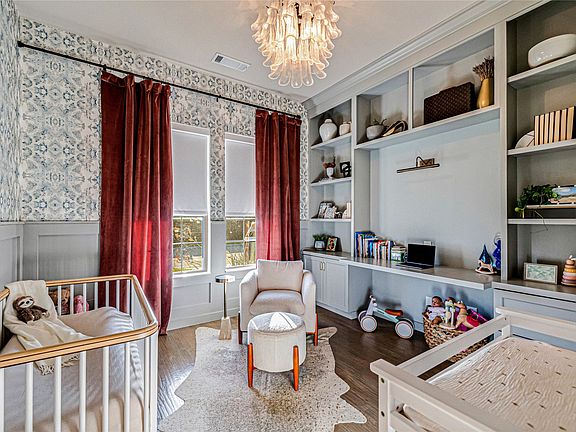 Built by Britton Homes and located in Celina’s desirable Light Farms – Hazel neighborhood, this beautifully updated home combines timeless architectural details with modern upgrades. Graceful interior archways and nailed-down hardwood floors create a warm, inviting atmosphere throughout the main level. The layout includes a dedicated office with custom built-ins and a flexible downstairs secondary bedroom featuring its own built-in workspace and designer wallpaper—ideal for guests or a second home office.