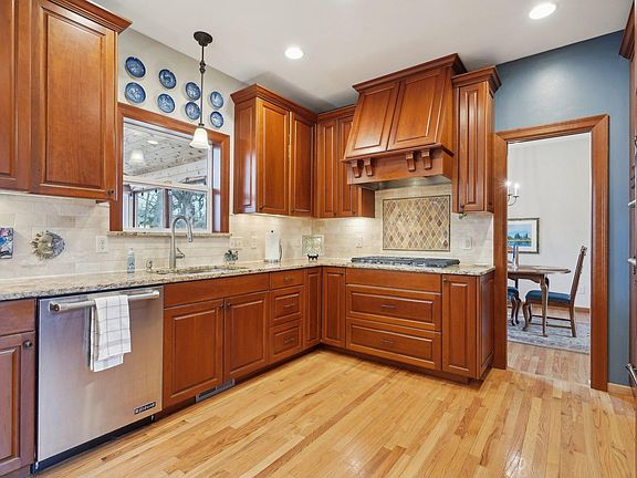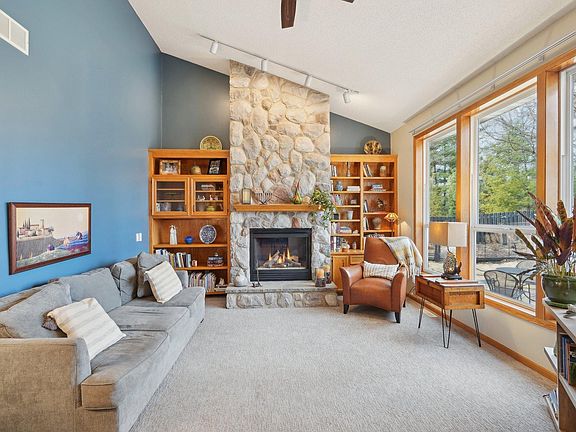 Situated in a serene neighborhood - down the street from Lake Minnewashta, this stunning two-story home combines modern upgrades with classic appeal. The family room boasts soaring 14-foot vaulted ceilings and a striking stone fireplace, offering picturesque views of the wooded backyard. A fully updated kitchen, features custom cabinetry, granite countertops, and a spacious walk-in pantry with built-in shelving and storage. Just off the main living area, a bright three-season porch overlooks the private, fenced-in backyard, creating a perfect spot for relaxation.