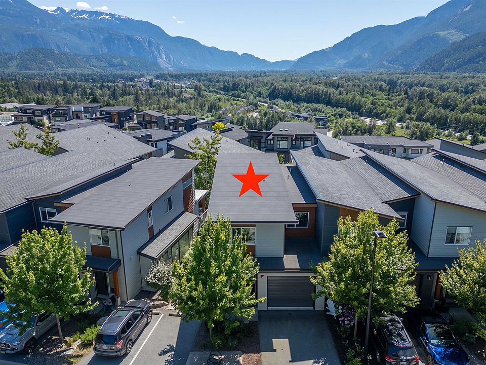 RARE Ridge plan end townhouse at SKYRIDGE - 1 of only 4. Bright, modern + expansive 2100 sq.ft. on 3 levels. Enjoy the abundant light from 6 extra windows + 9 ft ceilings in open plan living w/doors to upper south deck w/mtn views. Additional south patio + option for private fenced yard off lower level rec room w/ roughed in 4th bathroom. Primary bedroom features vaulted ceiling, transom windows + 5 pce ensuite. Wake up to VIEWS of the Chief, Shannon Falls + Tantalus Range and enjoy all day sun! Featuring gas f/p + stove, Kitchen Aid SS appliances, modern cabinets, quartz counters, pantry, heated tile flrs, wool carpets, h/w fls. 20 ft driveway + single garage. Steps to Skyridge Montessori school. Enjoy living steps to forest,world class MTB trails + Alice Lake. Easy highwy access!