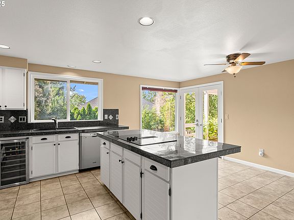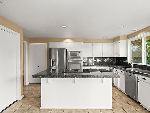 This beautifully maintained split-tri-level home is situated on a spacious 10,100 sq. ft. lot, offering privacy, functionality, and ample room to entertain. The expansive fenced backyard is a true highlight, featuring a large grassy area, mature landscaping, and a wood-burning freestanding fire pit. The main floor offers an open and welcoming design with separate living, sleeping, and entertaining areas. The vaulted living room is filled with natural light from floor-to-ceiling windows centered around a striking stone surround wood-burning fireplace. The adjacent dining room seamlessly flows into the kitchen, which features a large cook island, granite countertops, stainless steel appliances, a wine refrigerator, and a cozy eating area with a ceiling fan. French doors from the kitchen lead directly to the covered deck, creating an effortless indoor-outdoor connection. Upstairs, the primary suite features three closets, plus an ensuite bathroom boasting natural light from a skylight and a walk-in shower. Two additional bedrooms and a full bathroom complete the upper level. The lower level is ideal for entertaining or multi-generational living, featuring a spacious family room, a second fireplace, and a wet bar. French doors open to the backyard, enhancing the home’s flow for gatherings. A fourth bedroom, a full bathroom, and a dedicated laundry room complete this level. Additional updates include the replacement of windows in the living room, primary bedroom, and lower-level entertaining area. The split-tri-level layout ensures privacy and functionality, with distinct living, sleeping, and entertaining areas. Located in the highly coveted Westlake community, this home is surrounded by wide tree-lined streets and offers easy access to Westlake Park, Mt. Park hiking trails, shopping, dining, and major highways. Served by the award-winning Lake Oswego School District.