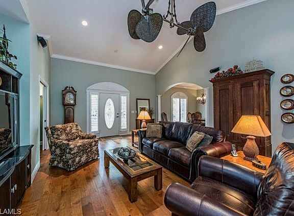 H.8964 - Welcome to your immaculate "Key West/Low Country" style 3 bedroom, 2 bath "close in" Estates home! West of Collier Blvd.! Situated on a beautiful and heavily wooded 2.57 acres, you will feel the tranquil setting as you drive down the long circular drive to this metal roofed home & relaxing covered front porch. The large living room opens out to the lanai where a peaceful waterfall spills into your large in ground spa. The brand new Birch Wood floors really show off this home's 2,080 sq. ft. under air. Custom plantation shutters throughout. Stunning new granite countertops set off the centrally located kitchen, perfect for entertaining guests. Other extras are accent lighting, stained glass lighting fixtures, tray ceilings, crown molding, 5 ¼ inch baseboards, & a vaulted living room with a large Bahama style double bladed ceiling fan. The side entry, oversized 2 car garage has a lighted workbench with overhead custom cabinets, and a whole wall of 4ft deep storage shelving for all your extras. A 1 year home trust warranty with certified AC unit is included as a plus for this perfectly maintained home. It is priced to sell, so please schedule your viewing appointment today.