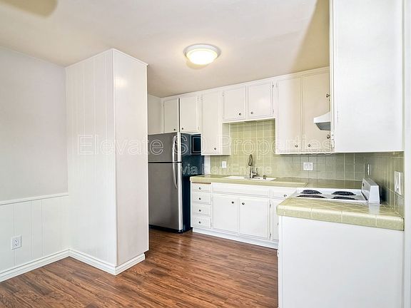 This two bedroom one bath features: spacious bedrooms, huge living room/dining room space, vintage inspired kitchen with white cabinets, vintage tile countertops and backsplash, white appliances (electric range, garbage disposal, and refrigerator). Brand new woodstyle flooring throughout! Perfect if you have pets!