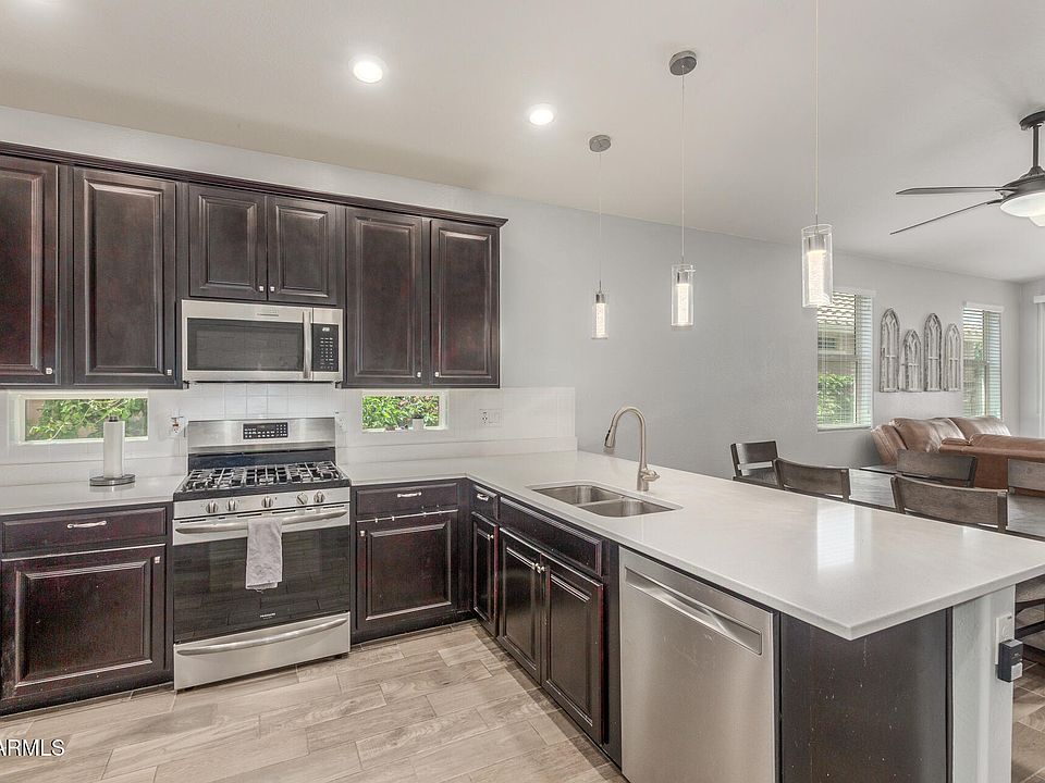 Stunning single-level home with 5 bedrooms and 3 full bathrooms, offering a spacious open floor plan & plenty of natural light. Gorgeous tile flooring flows throughout this great room concept home filled with upgrades & high-end finishes. The gourmet kitchen features quartz counters, stainless steel appliances, gas range, & stylish raised panel cabinetry. The oversized master retreat includes a tiled shower, dual sinks, & ample space to unwind. Enjoy outdoor living under the covered patio and the private, low-maintenance backyard—perfect for relaxing or entertaining. Home is part of the wonderful Anthem community offering amazing amenities including community center & pool, pickleball courts, tennis, kids' parks, fitness center, Big Splash Water Park, family events & more. A MUST SEE!