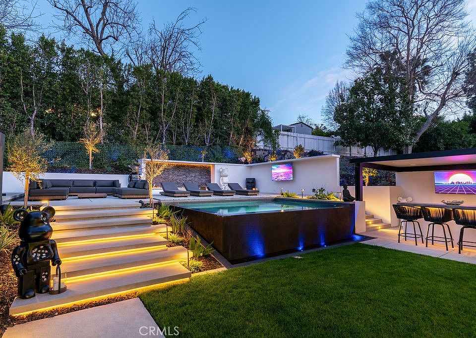 Downstairs, the panoramic doors open fully to the lushly landscaped backyard with a covered outdoor entertainment space complete with a sun patio, a top of the line outdoor kitchen, a large concrete gas fire table and a modern hillside concrete infinity pool with a waterfall complete with lush foliage creating a totally private outdoor oasis.