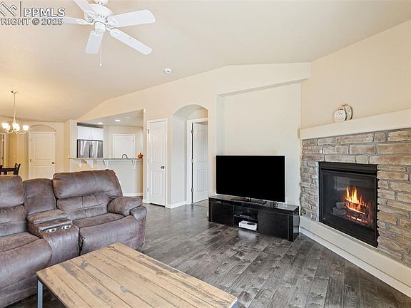 This stunning, move-in-ready ranch-style townhome offers the perfect blend of comfort and convenience. Featuring 4 spacious bedrooms, 3 bathrooms, and a 2-car attached garage, this home is ideal for a variety of living situations. Step inside to an inviting, light-filled interior where large windows and neutral tones create a warm, welcoming atmosphere. Custom stained-glass accents add a touch of charm and elegance. The open-concept main floor features stylish engineered hardwood flooring, a modern kitchen with sleek finishes and a breakfast bar that flows into the formal dining area, and a cozy living room with a gas fireplace. Sliding doors lead out to a private patio and fenced yard—an ideal setting for enjoying your morning coffee or dining al fresco. The spacious primary suite offers a tranquil retreat with a luxurious ensuite bathroom, double vanity, walk-in shower, and an oversized walk-in closet complete with built-in shelving. The main level also includes a convenient laundry room with washer and dryer, an additional office or guest room, and a powder bath for guests. Downstairs, the finished basement provides even more living space with two additional bedrooms, a full bathroom, a generous family room perfect for entertaining, and a bonus room that could serve as a hobby area, workshop, or extra storage. Natural light fills the lower level, making it feel just as bright and open as the main floor. Set on a quiet street and backing to open space for added privacy, this home offers easy access to major roads including North Academy and Powers, plus nearby shopping, dining, and entertainment. Commuters will appreciate the short drive to Schriever, Peterson, the Air Force Academy, I-25, and Ft. Carson. Don’t miss this exceptional opportunity—homes like this don’t stay on the market for long!