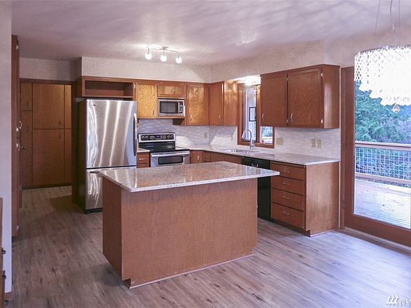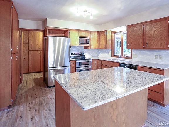 Exceptional Setting - Custom built home on Fishtrap Creek. Located on a beautiful & quiet street - you feel like you are worlds away but just a moment from town. Vaulted ceilings with exposed beams, windows rising up to the ceilings. Utility room has lots of built in cabinets, the washer & dryer & office space with a view out to the back. 2 bdrms, 2 baths on main floor. Basement recently finished with three bedrooms, full bath, office, large storage areas and spacious family room. Dining room looks out at the creek where salmon spawn.