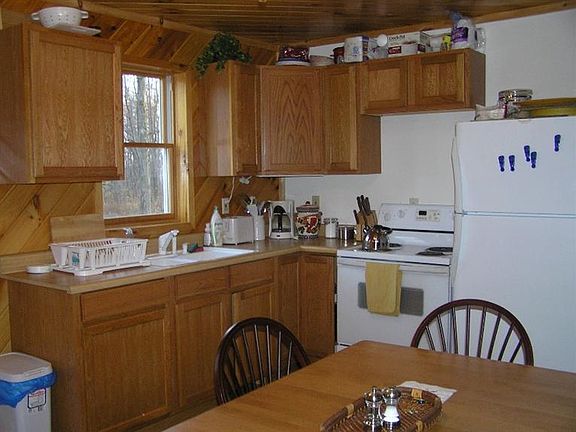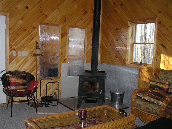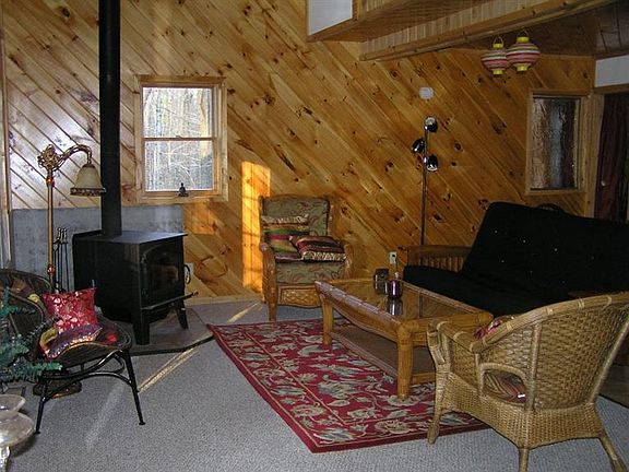 Embraced with autumn delight! Private and secluded this two bedroom, two bath cabin is nestled among the hardwoods on this level 5.24 acre lot. Located on a dead end, town maintained road. Knotty pine, wood stove, covered deck, plenty of land to walk, hike or quad.