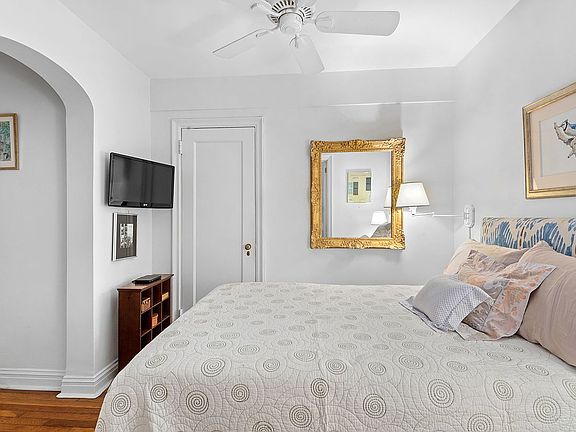 The welcoming entry hallway, with a walk-in closet and spacious foyer, leads you through an arched opening straight into the large living room and dining room. Beautiful hardwood flooring, beamed ceilings, classic baseboard molding, and arched doorways all add to a pre-war feel, whereas window shutters allow light in while providing full privacy. Approximately 660 square feet and legally a studio apartment, the apartment functions as a one-bedroom with a separate sleeping area and a closet, off the living room space. The arched hallway with another closet leads you to a windowed, sizeable bathroom. The windowed kitchen is efficiently laid out with Empava 2-burner induction cooktop, toaster oven in the cabinet above, GE microwave below, Bosch dishwasher, and LG refrigerator. Four extraordinarily generous closets in total.