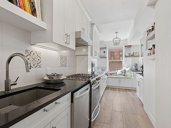 The large, windowed kitchen has been thoughtfully renovated and designed for both cooking and entertaining. A banqueted dining alcove provides the perfect setting for gatherings, while premium finishes and appliances elevate the space: Radianz Aquarius quartz counters, an LG French-door refrigerator with ice maker, Miele range, five-burner cooktop, and dishwasher. Custom floor-to-ceiling cabinetry, a spacious pantry, and clever storage solutions in the dining banquette ensure everything has its place, while upgraded electrical outlets and a built-in water filter add smart convenience.