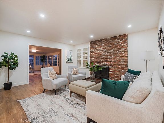 Inside, enjoy a spacious living room with charming built-ins and a cozy family room with a wood-burning fireplace that flows into the enclosed patio, creating a flexible great room. The kitchen features freshly painted cabinets, recessed lighting, stainless steel appliances, and direct access to the 2-car garage for added convenience.