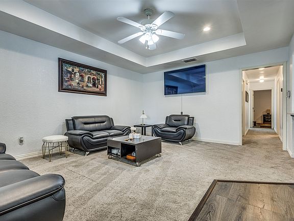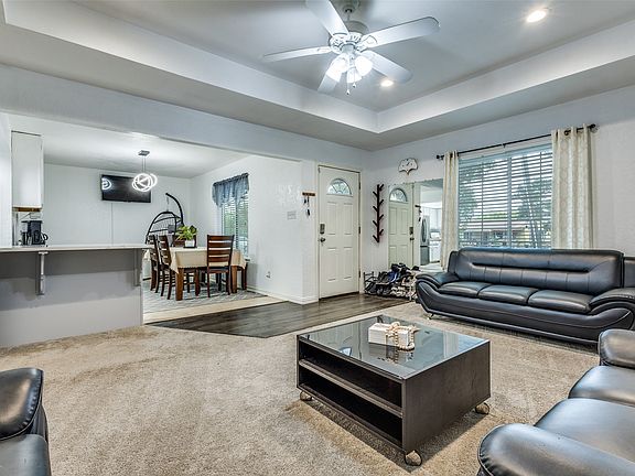 Open patioSpacious family roomNew quartz countertopsTray ceilingModern backsplashFresh landscapingOpen layout