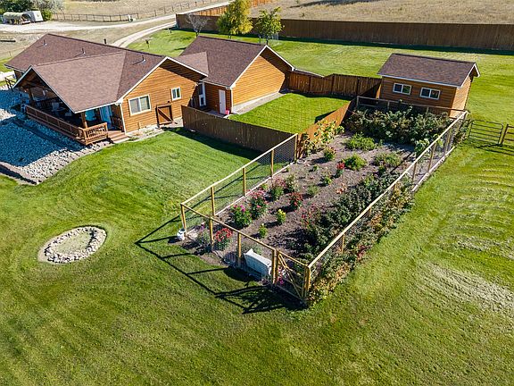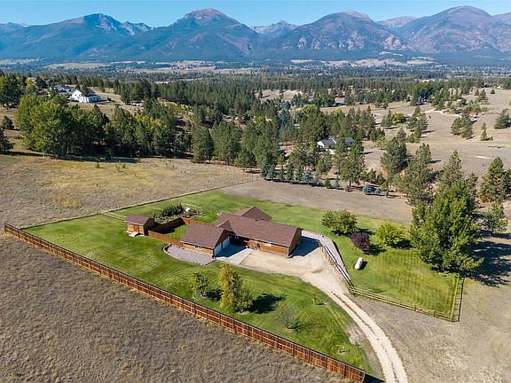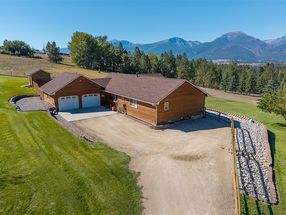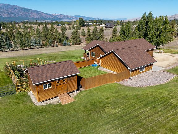 Enjoy easy one-level living in this charming log-sided home on 2.23 acres in the beautiful Bitterroot Valley. The light-filled living room showcases a beautiful river rock hearth and gas fireplace, while the spacious kitchen with breakfast bar flows to a dining area that opens onto a large covered deck—perfect for taking in the expansive mountain and big sky views. The primary bedroom has an ensuite bathroom with double vanity and walk-in shower. Two additional bedrooms provide flexible space. A convenient laundry room leads to the two-car garage with built-in cabinets, countertop, workbench, and storage above. Outdoors, you will appreciate the extensive landscaping, fenced yard, garden area, firepit, and mature fruit trees. The well-lit storage shed is a nice bonus. With a new roof, new luxury vinyl plank flooring, central air, and underground sprinklers, this tidy, well-maintained property combines comfort and convenience.
