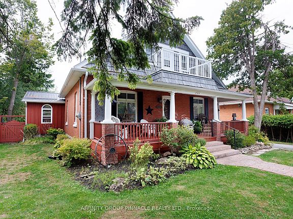 This inviting century home offers three bedrooms and one and a half bathrooms, including a convenient main floor bedroom and a primary suite equipped with a private two-piece ensuite. The property features a durable metal roof and classic brick construction, ensuring lasting curb appeal and easy maintenance. Set on an expansive double L-Shaped Lot with two driveways accessing two roads, the home provides ample space for outdoor activities, gardening, or future expansion. During the warmer months, enjoy the above-ground pool and private deck, perfect for entertaining or relaxing in the sun. Inside, you'll find a large, open-concept kitchen designed for family gatherings and culinary creativity. The spacious main floor includes both a living room and a family room, offering plenty of room for relaxation and hosting guests. This remarkable property blends timeless character with modern comforts, presenting a rare opportunity to own a home with generous living space and exceptional outdoor amenities. Walking distance to town.