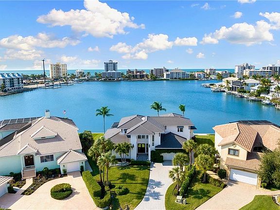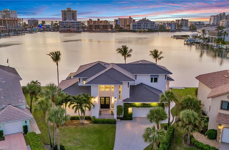 $1 million price improvement heading into season! Welcome to the captivating 414 Palm Ct, a jewel nestled in the heart of Naples, Florida. This stunning property, a winner of the prestigious Sand Dollar award, is a testament to refined living, where every detail is meticulously crafted. This award-winning residence is situated on one of the best lots in all of North Naples, with 173 feet of frontage and long wide bay views. Offering four spacious water-facing bedrooms, each accompanied by its own bathroom, this property is a beacon of comfort and luxury. An additional den provides that extra space for your hobbies or home office. Every day here ends with a spectacular sunset, painting the sky with hues of orange and pink. Water lovers, imagine fishing right off the back of your home or enjoy paddle boarding or kayaking amongst the local dolphins. With direct waterfront access and a private boat dock, your nautical adventures are just steps away. And when you're done sailing, take a dip in the pool or unwind in the hot tub as you watch the sunset. The open floor plan offers a seamless flow from the indoors to the outdoors. The large lanai, complete with an outdoor kitchen, is the perfect spot for alfresco dining or lounging under the Florida sun. Two primary suites provide an extra touch of luxury, offering a private retreat within the home. Each suite is a sanctuary of comfort and style, with ample space, natural light, and breathtaking bay views. Another huge advantage to this home compared to others is that it is located on a street with just 7 homes, and it is the closest street to the beach! Walk to the Ritz-Carlton for drinks or dinner on the beach as well as Turtle Club and Baleen, some of the only Gulf front dining in all of Naples. The popular Mercato retail center is a 5 minute drive where you can find Whole Foods, a brand new Movie Theater, shopping and over 12 great restaurants. The owners currently enjoy a custom screened in cage, but it can easily be removed if the buyer desires. 414 Palm Ct is more than just a property; it's a lifestyle. A place where every day feels like a vacation, and every sunset brings a new spectacle to enjoy. This is your chance to experience the best that Naples has to offer, in a home that's as unique and captivating as the views it offers. ****This home was custom built at a higher elevation than required, no interior water intrusion during the last 3 hurricanes, even Hurricane Ian! Extremely rare for this area and very in demand! Seller also has transferable flood insurance at well below current market rate.