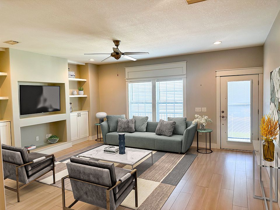 Upon entry, a quaint front porch welcomes you, hinting at the warmth that lies within. The living room is adorned with built-in bookshelves, adding a touch of elegance while offering a space to showcase your literary treasures or cherished mementos. Natural light streams in through well-placed windows, illuminating the open living area and creating an inviting atmosphere for gatherings and quiet moments alike.