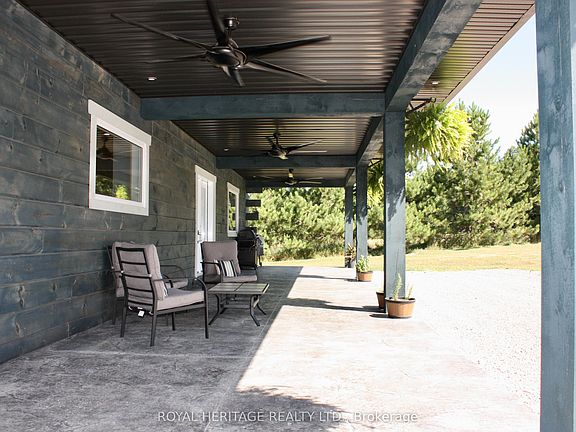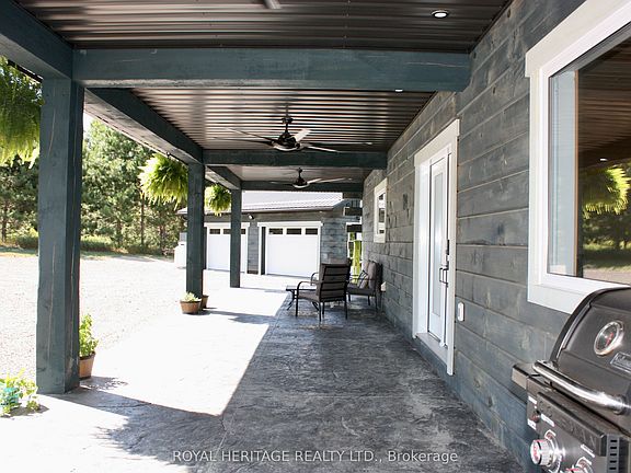 This rare offering delivers the ultimate in timeless modern log home architecture with custom finishes and lifestyle flexibility. The ground level front entrance steps to an inviting open concept layout. Foyer is large, bright and airy and can lend itself to an added dining area. Chefs kitchen includes a huge island, tall cabinetry and beautiful quartz counters. Just off the kitchen are the pantry and laundry room that function well as a butlers pantry or prepping area. Note 6 1/2 inch engineered Hickory floors through out and kiln dried pine trim, ceiling and casings. The great room exudes warmth and comfort boasting built in floating shelves and views from every window. Primary bedroom functions beautifully with huge walk in closet, 4 piece ensuite w his and hers sinks and walk out to a 20 x 12 foot back porch, the perfect spot to enjoy your morning coffee whilst soaking up the tranquil views and sounds of nature. Bedrooms 2 and 3 are well sized and share a 4 piece bath. One of the finest attributes of this home is it's huge covered front porch w 2 gas hook ups. Picture an ample seating area with a fire table and a dining area with BBQ, all this under twirling porch ceiling fans. Now, the garage is a show stopper to be sure, detached, 2 car but could fit 3 vehicles, 200 amp service and ICF 4' foundation walls. Looking for a workshop? This garage will inspire the hobbyist, musician, contractor, wood worker, car enthusiast. Perhaps create your dream man cave or studio. Room for all the tools and toys. In this home both interior and exterior lighting offers night mode. All smartly controlled by AI but can also be manual. Looking to disconnect or reconnect? With plenty of space for parking, playing or just plain relaxing feel free to expand, create or simply breathe. Lake access just down the street to boat launch. Please enjoy the attached Iguide video, information sheet and floor plans. Come on home to the country.