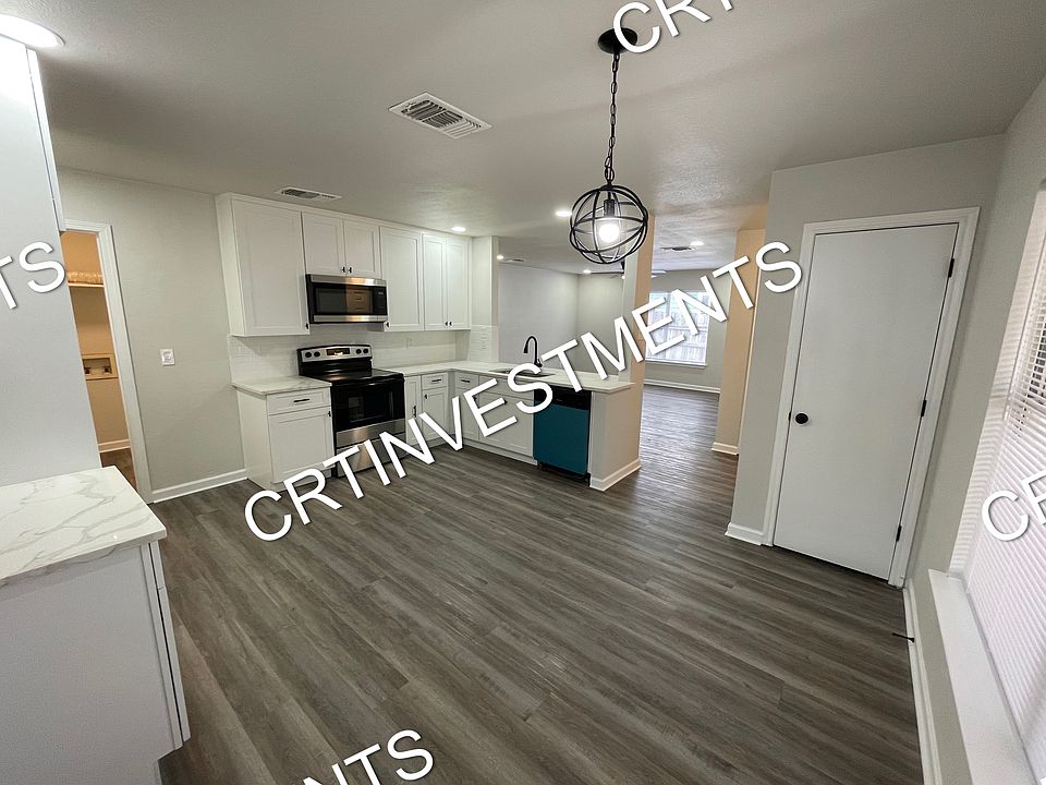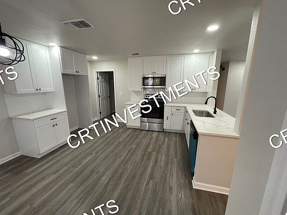 Recently renovated with new central A/C and appliances. New LVP flooring throughout as well as new kitchen cabinets and countertops. Updated bathrooms and new ceiling fans. There are 4 bedrooms and 2 full bathrooms, which makes it perfect for families. The kitchen is roomy and has a pantry, ample cabinets, and counters. Spacious laundry room and store room in backyard. Neutral paint throughout the house.
