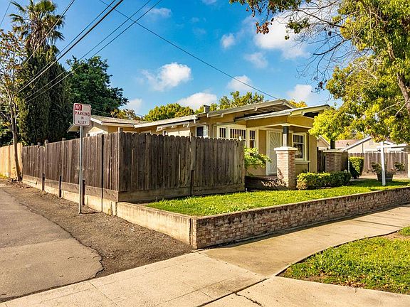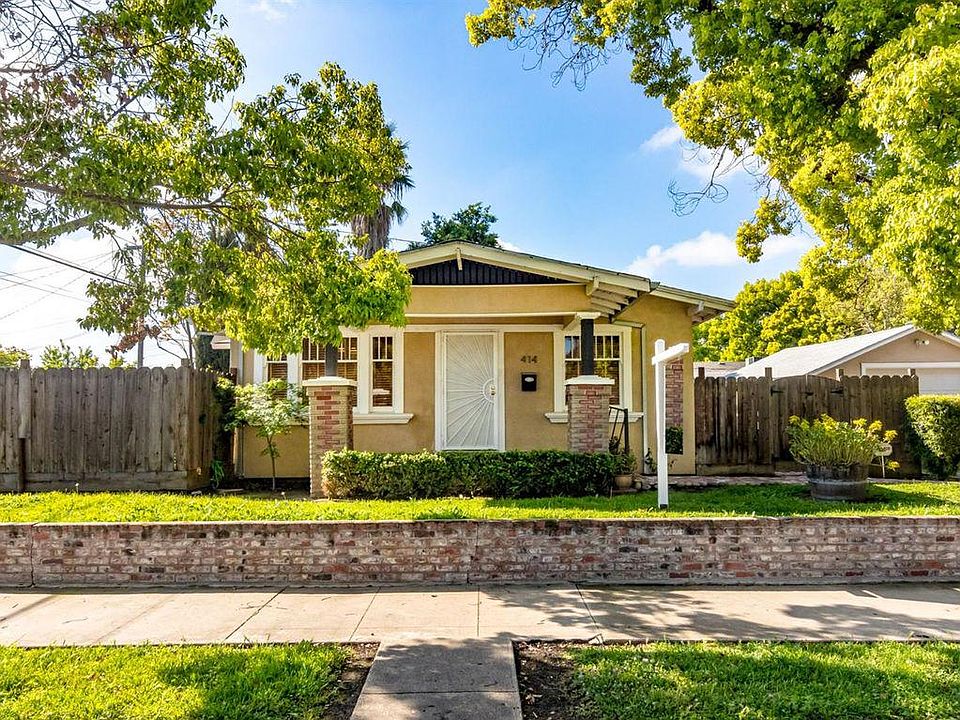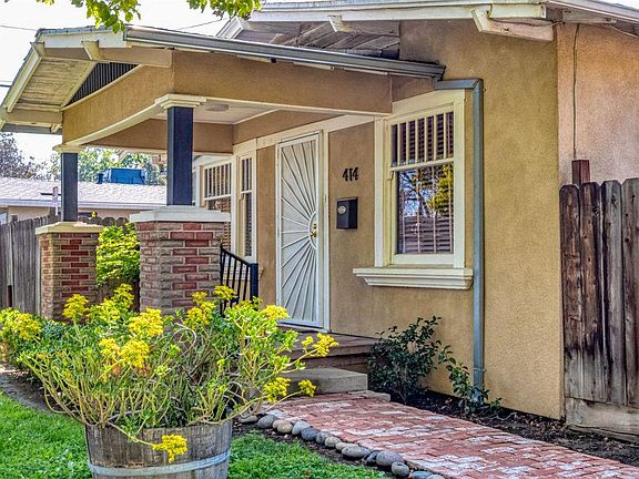 Charming bungalow located in convenient downtown Modesto! Raised front yard with brick planters and walkway leads to the covered front porch. Dining room has vintage built ins, ceiling fan/light and hardwood floors. The living room has hardwood floors, french doors and faux electric fireplace feature. Good size kitchen has tile counters, lots of cabinets for storage, dishwasher and comes with a fridge. Bonus indoor laundry area comes with the washer & dryer. Mud room or possible office adjacent to laundry area. Two bedrooms with carpeting and ceiling fans. Full bathroom has a shower over tub and tile floors. Two private side patio areas with custom brick patios. Detached one car garage with automatic opener. Come see this affordable and charming home convenient to shopping, restaurants and freeway access.