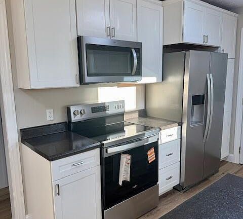 Inside, the spacious living room showcases double-tilt windows, a ceiling fan, and recessed can lighting, creating a warm and inviting atmosphere. The updated kitchen features 36'' soft-close cabinetry, brand-new refrigerator, stove, microwave, and dishwasher, and plenty of workspace for cooking and entertaining.
