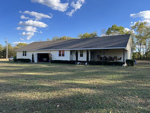 This is a special property for multi generational living. Two homes on one level all under one roof. One side has a nice covered side porch. One very spacious bedroom and a full bath. Open floor plan for living room, kitchen with gas stove and dining area with wood floors. Large laundry room and the gun safe remains. The main living quarters has 2 bedrooms and 2 full baths. Beautiful kitchen/dining combination with breakfast bar and access to the covered patio. Living room with wood floors. Huge theater room. Theater seating, projector, screen, bar, desk and shelving all remain. Large laundry room. This is situated on 5.89 private acres where the deer and turkey roam.