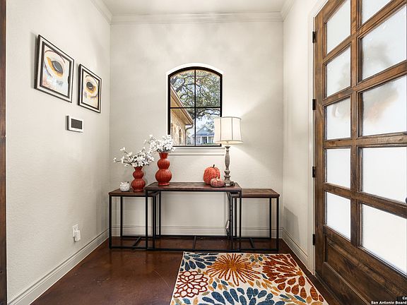 Incredible Opportunity to Own a Slice of Country Paradise! This stunning rustic Hill Country-style home, built by Serenity Custom Homes, is nestled on a Texas-sized 0.61-acre lot surrounded by mature trees and nature-inspired settings. With showstopping curb appeal and a spacious front porch, it's the perfect spot to enjoy your morning coffee at sunrise or unwind after a long day. Inside, the 1.5-story open floor plan was thoughtfully designed for seamless indoor-outdoor living, ideal for both everyday comfort and entertaining. Exquisite craftsmanship shines throughout - from the cozy floor-to-ceiling stone fireplace and sliding barn door, to the custom wood trim framing the family room entryway, adding warmth and rustic sophistication. The main-level primary retreat offers a private escape with a large walk-in closet, walk-in shower, and soaking tub - a perfect place to relax and recharge. Upstairs, the expansive 4th bedroom with its own full bath provides flexibility for a guest suite, mother-in-law retreat, or an impressive game or media room tailored to your needs. Step outside to your one-of-a-kind backyard oasis, featuring a large deck overlooking the sparkling pool - the ultimate backdrop for entertaining or enjoying peaceful Texas evenings. Located in a community with resort-style amenities, this home delivers the feeling of a year-round vacation. Truly, a rare find that captures the perfect balance of rustic charm and modern comfort.