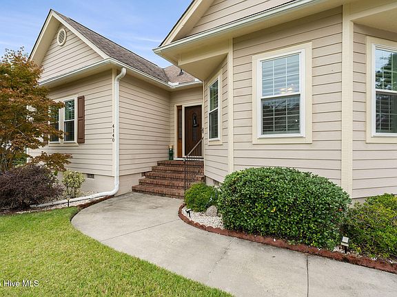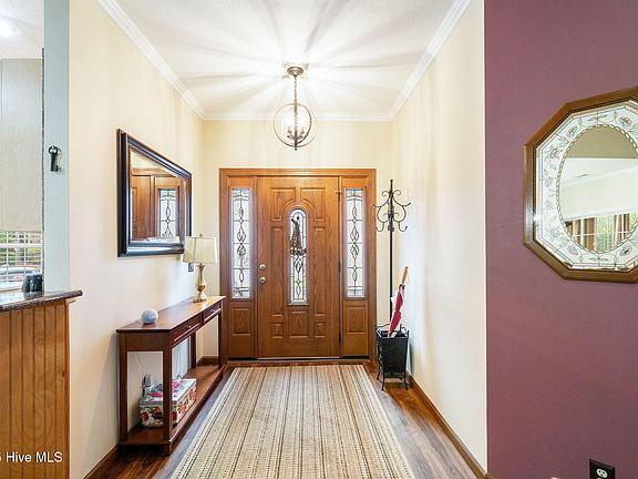 This inviting 3-bedroom, 2-bathroom home offers 1,793 heated square feet of comfortable living space in the popular Georgetown neighborhood of St. James Plantaiton. Located on a quite half circle, this one level living home backs up to a nature buffer and pond. A paved double driveway leads to the two-car garage, while a walkway and brick steps welcome you to the front door. Inside, warm LVP flooring extends through the foyer into the spacious open great room, where a vaulted ceiling draws attention to the stunning floor-to-ceiling fireplace surround. Beautifully accented with stacked stone, tile, and custom millwork, the fireplace serves as a striking focal point, flanked by custom built-in cabinetry that blend functionality with refined style. The great room flows seamlessly into the dining area and a beautifully appointed kitchen, creating an ideal space for family and friend get-togethers. An extended peninsula with bar-height provides additional seating, while striking black granite counters, Craftsman-style maple cabinetry, and a stone tile backsplash add timeless elegance. A central island with a white granite countertop provides extra prep space and visual contrast, and a charming bay window fills the breakfast nook with natural light. Beyond the dining area, a sliding glass doors open to a cozy sunroom, a large open deck, and a private backyard perfect for enjoying the mild NC weather. The private owner's suite is a relaxing retreat featuring classic crown molding and providing direct access to the sunroom. A spacious, well-organized walk-in closet provides generous storage, while the spa-like en-suite bathroom invites relaxation with its jetted soaking tub, custom-tiled walk-in shower with a corner bench, and handheld showerhead. Conveniently located just outside the owner's suite, the stackable washer and dryer make laundry day a breeze. Two comfortable guest bedrooms, each with ample closet space, share a nicely updated full bathroom ideal for family or