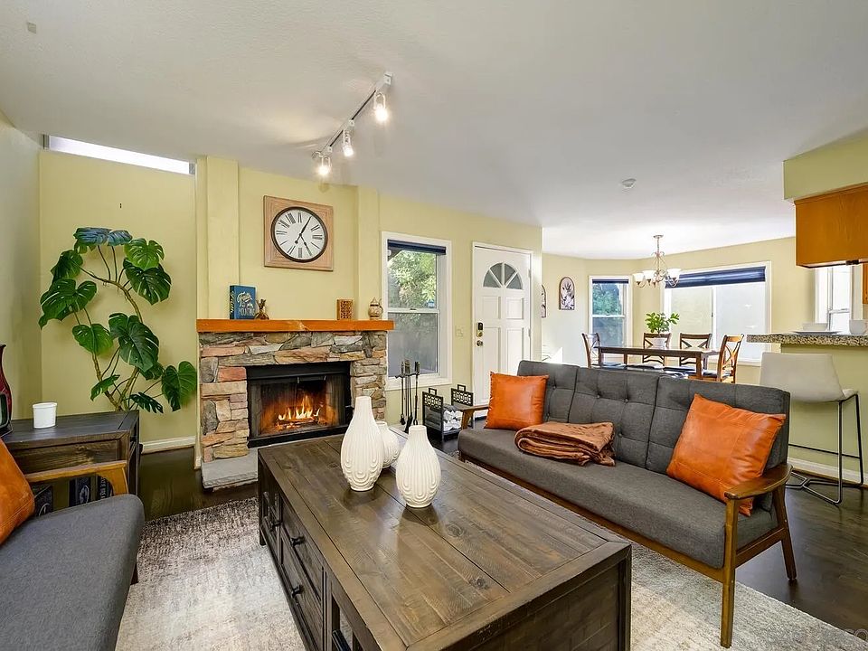 Cozy wood-burning fireplaceRecently refinished hardwood floorsIn-unit laundry