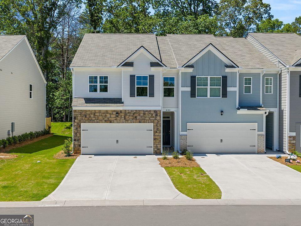 Falcon Landing in Gainesville, GA is home to the Sudbury at 4140 Kestrel Court, a new-construction townhome near the beautiful Lake Lanier. This Sudbury two-story townhome plan features 3 bedrooms and 2.5 bathrooms in 1,877 square feet along with a 2-car garage. As you step off the front porch, a long foyer welcomes you and leads into the open-concept main living area. A large family room is the perfect place for family and friends to gather or for a quiet night with a book or movie. The family room flows seamlessly into the well-appointed kitchen with a center island, quartz countertops, white subway tile backsplash, beautiful white shaker-style cabinetry, and stainless-steel appliances. A dining area directly off the kitchen provides space for a dining table and opens onto the back deck or patio. There is also a half bathroom tucked away on the first floor. Up the stairs you'll turn from the landing into the primary suite. A spacious bedroom is complimented by the en suite bathroom featuring a separate tub and shower, dual vanity, water closet, linen closet, and a roomy walk-in closet. Across the landing you'll be led into a loft area that's perfect for a game room or second living space. 2 secondary bedrooms, the laundry room, and an additional bathroom, also with dual vanity, round out the upper floor. Schedule an appointment to tour this Sudbury at 4140 Kestrel Court in Falcon Landing and make lake Lanier your home today!