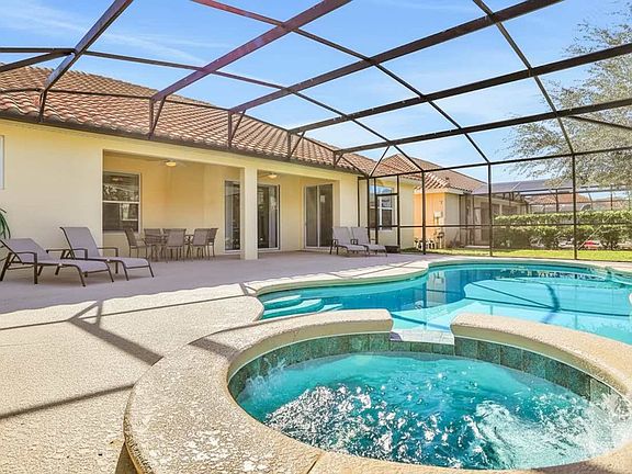 This home features a comfy living area, a full kitchen with stainless steel appliances, and spacious indoor and outdoor dining areas. Enjoy the convenience of a free washer and dryer, along with access to outdoor pool loungers. The fully stocked kitchen has everything you might need to make a big breakfast. The family room is equipped with a flat screen TV and ample seating. Indulge in the luxury of a private pool with an option to add heat, perfect for soaking up the Florida sun.