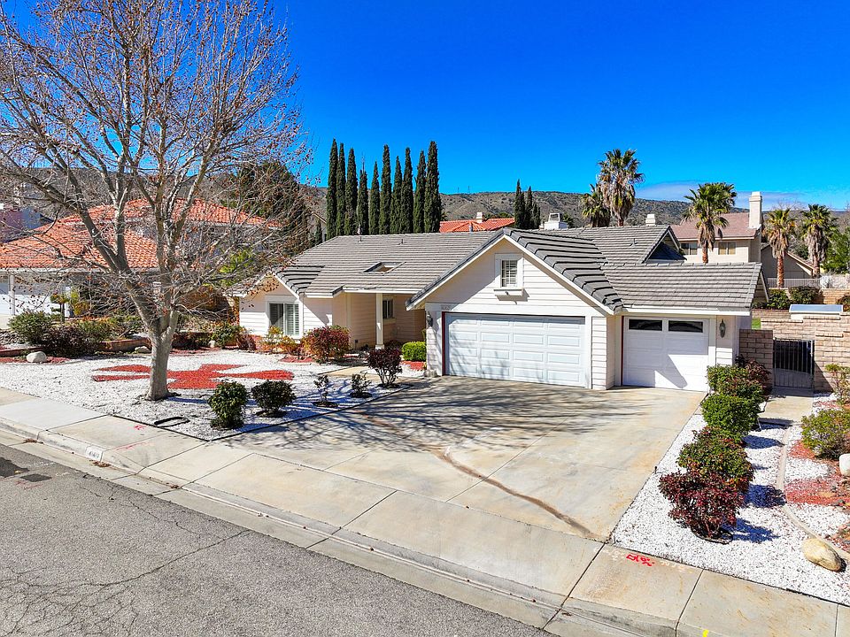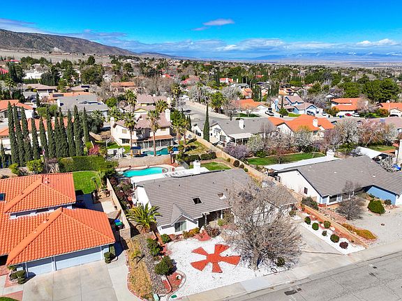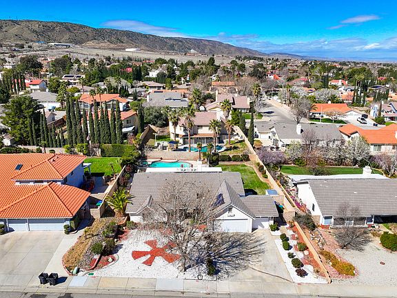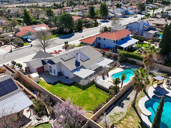 Discover this beautifully single-story home in West Palmdale, offering over 1,800 sq. ft. of comfortable living space. This 3-bedroom, 2-bathroom home boasts an open-concept kitchen with elegant granite countertops, ample cabinetry, and a seamless flow into the dining and living areas—perfect for entertaining. The living room features a cozy fireplace, creating a warm and inviting atmosphere, while plantation shutters throughout the home provide both style and privacy. Step outside to your spacious backyard oasis, complete with lush green grass, a covered patio, and a sparkling swimming pool, perfect for relaxing or hosting gatherings. Plus, enjoy the benefits of solar panels, helping to keep energy costs low. Conveniently located near top-rated schools, shopping, dining, and golf course. Conveniently has a 3 car garage with a drive-through garage to store more vehicles. this home is a must-see!