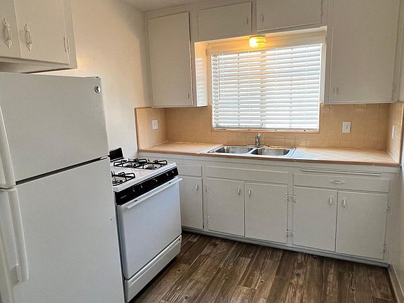 Large windowsCloset spaceCeiling fanWood flooringTub and tileGas stoveFauxwood blinds