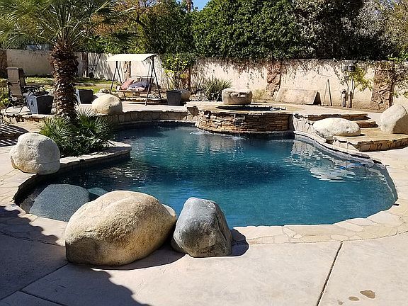central heating and air, swamp cooler, solar energy system, inground swimmimng pool/ a spa, fire place. Granite and Quartz counter tops, wet bar, laminate, wood and tile flooring. RV parking. Fully custom redesigned masterbath with spa tub and walk-in shower. Built-in outdoor barbecue.