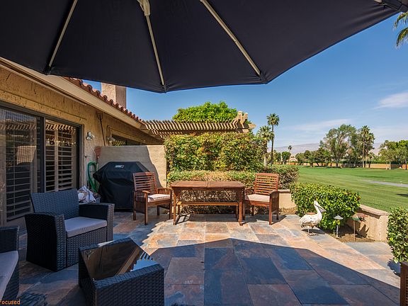 Experience refined desert living in the prestigious Woodhaven Country Club. Perfectly positioned on the 10th fairway, this beautifully renovated Oakmont condo showcases sophisticated slate flooring, luxurious granite countertops, and custom cabinetry throughout. Enjoy seamless indoor-outdoor living with a new extendable patio umbrella, natural gas BBQ, and stylish outdoor furnishings--ideal for entertaining or relaxing in the serene golf course setting.Inside, the open-concept living area features an electric reclining leather sofa set, flat-screen TVs, and elegant plantation shutters. The kitchen is equipped with newer, high-end appliances, while both bathrooms have been thoughtfully updated with modern walk-in showers for a spa-like retreat. Offered turnkey, this home is move-in ready--inviting you to immediately embrace the tranquil views and vibrant lifestyle of this sought-after desert community. HOA amenities include reduced rates for homeowners, golf memberships available, 7 newly resurfaced tennis, 4 pickleball courts; fitness facility and classes, club house, with full restaurant and lounge services and entertainment; banquet facility, 4 pools, putting course, activities and classes; guarded gate, landscaping, trash/sewer, cable/internet included in HOA dues. Don't miss your opportunity to own a piece of paradise in Woodhaven Country Club.