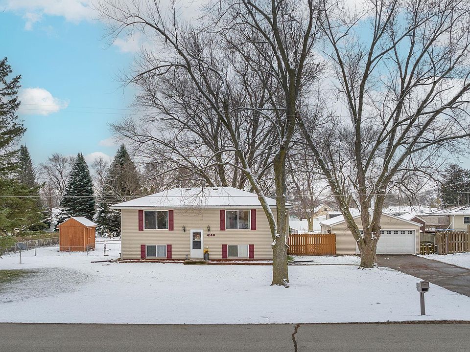 Instantly appealing! Fall in love with this split-level home that is meticulously maintained and situated on a half-acre lot! As you enter this awesome home, you will notice the open floor plan as the living spaces flow seamlessly from room to room! The main living space provides a warm feel with a beautiful fireplace and offers expansive windows that overlook the front yard. The eat-in kitchen is the perfect area for the family to gather as it provides ample room with great views of the rear yard through the glass sliding door. This great space flows into the kitchen featuring loads of cabinetry with plenty of counter-top space and beautiful stainless appliances. Two spacious bedrooms and full bathroom complete the main level. Entertaining will continue in the walk-out lower level that features an awesome family room. The lower level also includes two additional bedrooms and a bathroom. Storage space and a laundry space will be appreciated as well in the lower level. The exterior spaces of this home include a two-stall detached garage, fenced in backyard with mature trees, a rear deck, large workshop shed, and a separated storage shed. Located on a quiet cul-de-sac, this wonderful home will go fast! Act quickly!