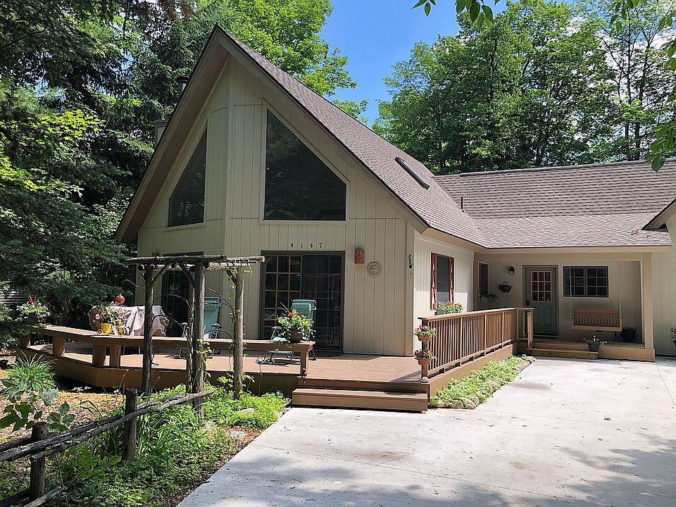 Living room and 3 bedrooms have cathedral ceilings, screen porch, front deck, front porch with swing, laundry in breeze way, attached garage, gas fieldstone fireplace, modern kitchen, loft