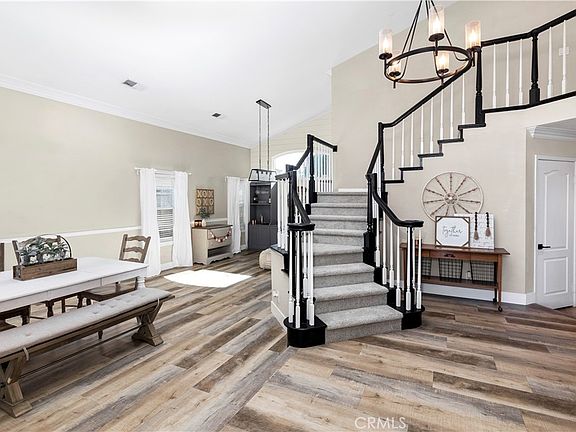Discover this exquisitely remodeled home in the heart of Murrieta, featuring the ultimate combination of luxury, comfort, and efficiency with 28 Owned Solar Panels and a Pool Sized Lot! Enjoy low taxes and a low HOA. As you approach, you are welcomed by a grand double-door entry that opens into a spacious and airy living and dining area, boasting cathedral ceilings and elegant crown molding.. The details in this home truly shine, with upgrades featuring gorgeous LVP flooring downstairs, plush new carpeting upstairs, energy-efficient dual-pane windows, Quiet Cool Whole House Fan, Newer AC/Furnace and stylish six-inch baseboards. Convenience is key with a powder room and laundry room located on the first floor, along with a charming formal sitting room perfect for entertaining. The family room, complete with a cozy fireplace, flows smoothly into a beautifully remodeled kitchen that any home chef would love, featuring new cabinets with soft-close drawers, a custom range hood, quartz countertops, a spacious center island with butcher block, and sleek stainless steel appliances. Upstairs features all 4 bedrooms including the Primary Suite! Retreat to the luxurious primary bathroom, which has been thoughtfully remodeled to include a custom vanity with dual sinks, a spacious shower complete with dual shower heads, a relaxing separate soaking tub & large walk in closet. Parking is a breeze with a 3-car attached garage that includes a 240 outlet with storage racks! Step outside to your bonus sunroom which leads to a sprawling backyard oasis on a 1/4 acre lot, complete with a covered patio and thriving mature fruit trees, including lemon, orange, apricot, and peach. All of this is conveniently located near freeways, shopping, and dining, making this home not only a beautiful sanctuary but also the perfect place for everyday living.