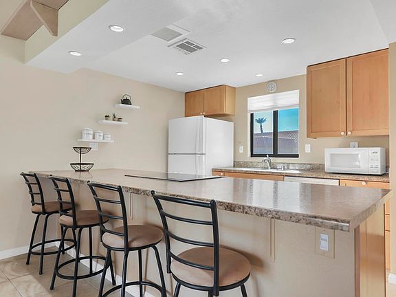 Located in the heart of Palm Desert, this beautifully updated 2 bedroom, 2 bath condo in the Palm Desert Resorter captures the essence of desert living. Enjoy fabulous east-facing fairway and mountain views from the extended covered patio, perfect for morning coffee or relaxing evenings. The kitchen has been opened up to create a bright, inviting space with new cabinetry and a seamless flow into the living area. Both bathrooms have been tastefully updated, and the home features tile flooring throughout except planked vinyl flooring in the bedrooms for a warm, modern touch. A 2-car garage has been added for convenience and additional storage. Experience resort-style living at its best with golf, tennis, pickleball, bocce ball clubhouse amenities, 20 pools and spas and a vibrant social atmosphere--all within the gates of this sought-after Palm Desert community. Short term rentals are allowed.
