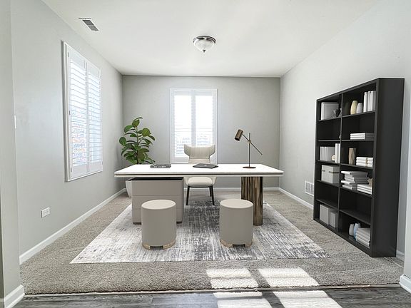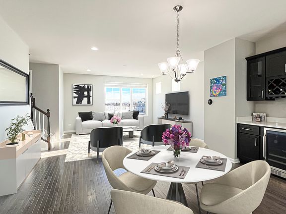 Welcome to this STUNNING CORNER END UNIT townhome in the Gramercy Square community! *NEW CARPET INSTALLED THROUGHOUT DEC 2024. This modern, low-maintenance property offers over 1900 sq. ft. of living space, combining style, comfort, and convenience. The first level features a large welcoming foyer and an extra room that can be used as a family room, home office, den, or gym. 2-car attached garage offers plenty of storage space and is equipped for EV charging outlet. Upgraded shutter blinds throughout first floor. The open-concept main floor features espresso colored hardwood flooring throughout, a spacious family room, and a custom dry bar area equipped with a beverage and wine cooler. The main attraction is the GOURMET KITCHEN equipped with upgraded QUARTZ COUNTERTOPS, 42-inch cabinets, a large 100 in. center island, STAINLESS STEEL appliances. This model's dining area is located next to living room, promoting an open space. Large walk-in pantry with plenty of shelves. Private balcony and a laundry room with custom cabinets for storage. The third level features the primary master suite, with a large walk-in closet and a luxurious ensuite bathroom with a dual vanity and walk-in shower. Unit includes two additional bedrooms, and a full bathroom. Home is wired with SMART technology. Located just minutes from the Rt. 59 Metra Station, I-88, Costco, Fox Valley Mall, and a variety of shopping, dining, and entertainment options. Ideal location being in the desirable district #204! Move-in ready and waiting for you to make it your own!