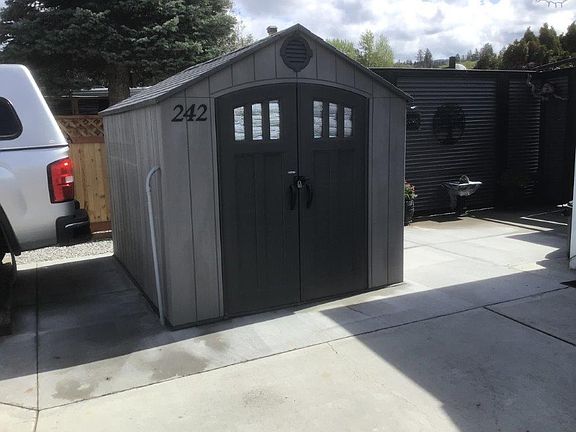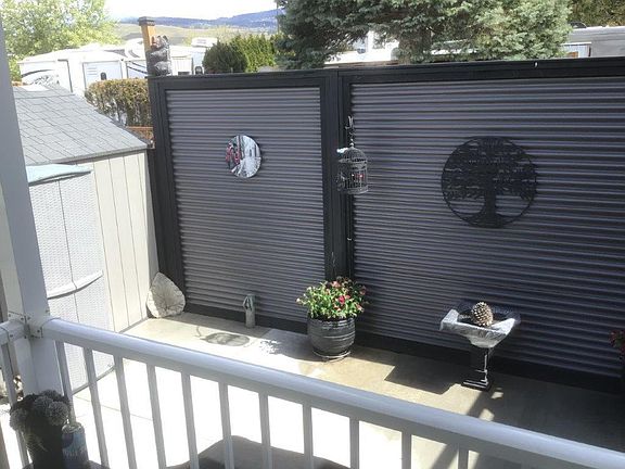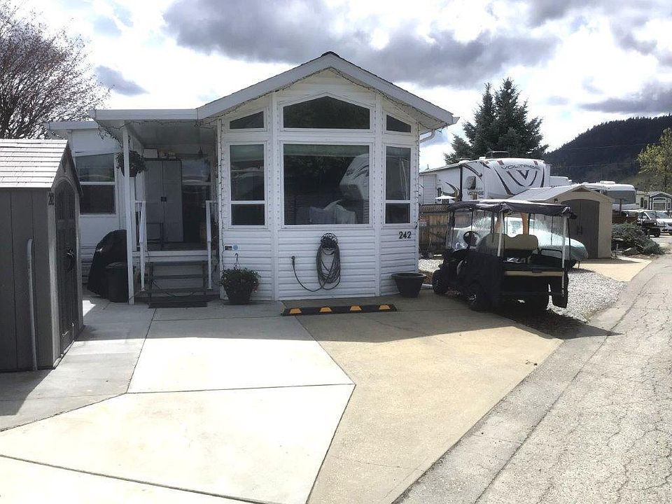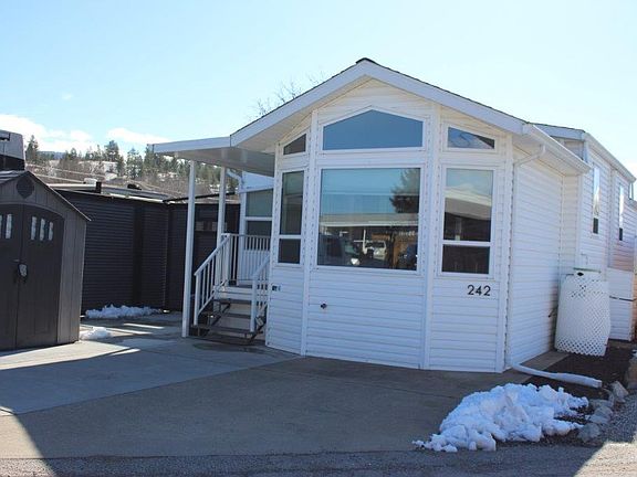 Beautiful Moduline Park Model with a 4 season Okanagan Room for added space located on a private low maintenance lot. Completely fenced in for additional privacy and safety for your pets. The open concept design allows for lots of natural light to flow throughout. The solar tube in the kitchen enhances the space. Updates in 2022 include: light fixtures, custom blinds, all appliances, 8 foot metal fence, 8 x 10 shed, 10 x 10 gazebo, and new concrete. The hot water tank was replaced in 2020. The water filtration system is included. The front and back decks are covered. Ample parking for 2 vehicles with extra parking for your guests. Centrally located to the Family Activity Centre, (Thyme at Ellison Lake restaurant, pool, hot tub & coin laundry), and the Rec Centre (indoor pool, hot tub, gym, social activities, hair salon). Lease goes to 2046. The lease is registered with the Federal Government and the Park Model ownership is transferred by Bill of Sale. The 2026 Annual Maintenance Fee is $5763 which includes security, water, sewer, use of the amenities, maintenance of the common areas and roads, snow removal and garbage disposal area. Property Taxes are payable to the City of Kelowna. Close proximity to Kelowna International Airport, UBCO, wineries, golf courses, Rail Trail, shopping and entertainment.