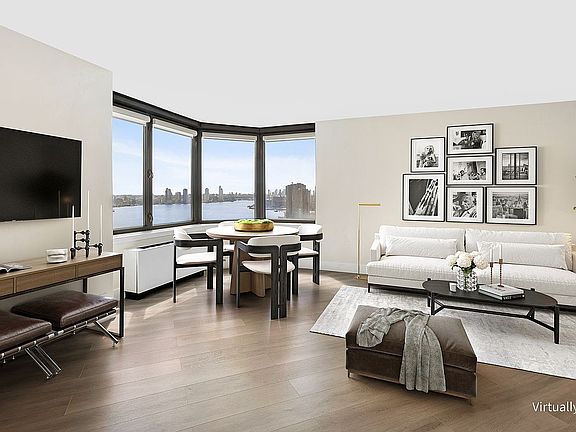 The well-proportioned, bright open living and dining room has a south-facing, corner bay window that invites sweeping, sunlit panoramas of the river and skyline.