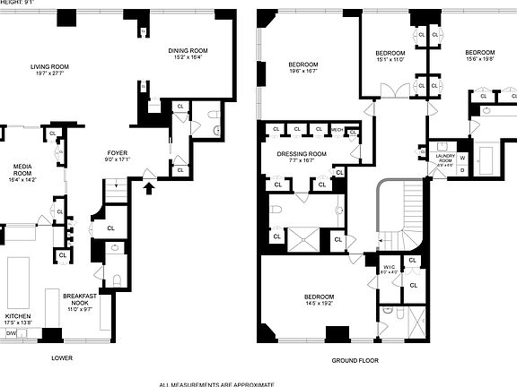 The first- floor greets you with a grand marble foyer that opens to a thoughtfully designed layout, both open and private. A formal living room, dining room with recessed wet bar, sitting room/media room, and kitchen are connected by arched doorways and storage-lined halls, many of which can be closed off with sliding doors. The space is bathed in natural light with southern and eastern city views. The windowed eat-in kitchen boasts white marble counters, 2 Viking ovens, a Viking 6-burner stove, a dishwasher, and a marble island with a built-in freezer. This floor also includes two powder rooms for guests.