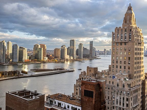 This expansive duplex in the prestigious St. James Tower, located in the heart of Sutton Place, spans the 25th and 26th floors and is connected by a striking curved staircase. Offering 4 bedrooms, 3 full bathrooms, and 2 powder rooms, this residence combines luxurious features with an impeccable design, creating the feel of a modern country home in the sky. Highlights include recessed lighting, dual-zone climate control, and floor-to-ceiling windows that frame stunning views of the East River, the Queensboro Bridge, and Long Island City.