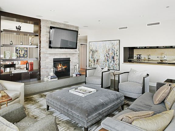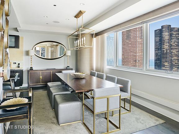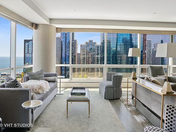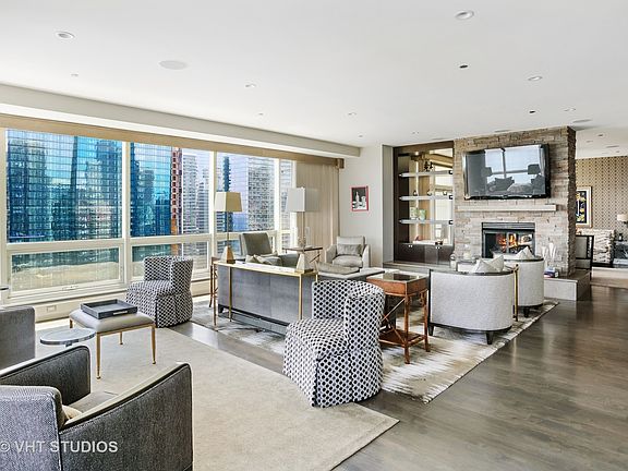 Enjoy sweeping views of the lake, Navy Pier, and the Chicago River from every window in this stunning, 5098 SQFT, 5 bedroom, 4.1 bath residence at Riverview. The living and dining rooms wraparound a corner view with two seating areas separated by a 2-sided fireplace, a balcony overlooking the river, and ample dining space for more than 10 people. The eat-in Snaidero kitchen features a breakfast bar, Miele, Sub-Zero, Viking, and Wolf appliances, and copious counter space. The graciously sized master suite offers northeast corner views of Navy Pier, the lake, and skyline and a newly redesigned walk-in closet. The luxurious master bath has heated flooring, double sinks, limestone flooring, steam shower, and private commode. Den with wet bar, balcony. 4 additional bedrooms all face north with spectacular river views, professionally organized closets. 3 additional beautifully appointed full baths all with heated flooring. Family room with balcony located between the 2nd and 3rd bedrooms is ideal for a kids media room or play area. A fully outfitted craft room features a built-in work space, shelving, and attached TV. Other highlights include C4 AV system with surround sound throughout the residence, Nest thermostat, automated shades in every room. This full amenity building offers a recently renovated gym and locker rooms with sauna, steam, an indoor pool & hot tub, 24-hr doorman, onsite engineer, separate pet entrance. 2 garage parking spaces (213 & 214) included in the price.