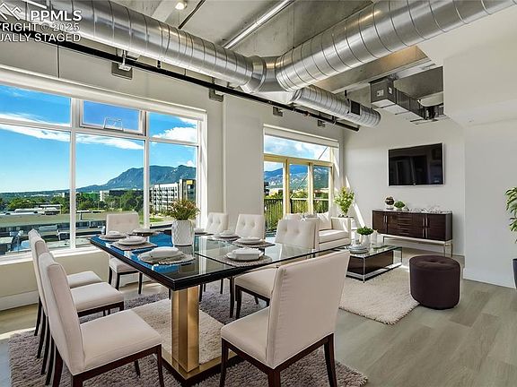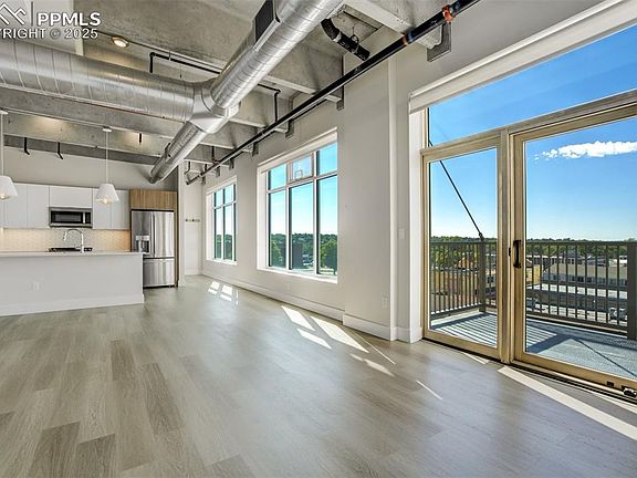 Looking for a lifestyle that puts you on the doorstep of downtown in one of Colorado Springs most dynamic neighborhoods? Check out this modern loft with clean lines, an open layout, efficient use of space, understated elegance, and luxury finishes. The three sets of floor-to-ceiling windows with panoramic Front Range Mountain views are designed to embrace and highlight Colorado Springs’ 300 days of sunshine a year. The design of this luxury loft incorporates oversized windows, 12-foot ceilings that take advantage of all the natural light combined with an industrial vibe finish. Located on the top floor of the PB&T bank building, this one-bedroom loft enters through the foyer and into the main living space with a large kitchen with modern cabinetry, quartz countertops, GE Profile stainless steel appliances including the refrigerator & gas range with oven, dishwasher, and a counter with seating. The kitchen is open to a dining area or office space and living room with a balcony featuring stunning mountain views. The bedroom has an ensuite bathroom with double sinks, quartz countertops, a large shower & the laundry area which includes a stacked washer and dryer. The open floor plan is complimented by the luxury vinyl plank flooring that runs throughout the entire loft. Built in 2021, this 4th floor Loft is accessed through the secure lobby and elevator or stairs. Includes one parking space in the gated/covered parking area, it has an on-site storage unit located on the same floor that is just down the hall, and the HOA dues cover ALL utilities. Enjoy what downtown has to offer! Imagine walking out your front door grabbing a quick cup of coffee, stopping for a visit with friends on your way home, or meeting up at one of the bars or restaurants for the downtown nightlife.