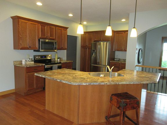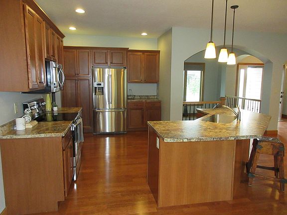 Beautiful 5 bedroom, 3 bath home with an open floor plan. Kitchen with island, dining area with access to outside deck and living room w/ fireplace. Pantry and laundry area with built-in desk, master suite w/ full bath (sit in tub & walk-in shower) and walk-in closet and bedroom/bath all on main level. Lower level has 3 bedrooms, full bath, storage room and family room. Triple attached garage and great location on East side. This home is move in ready.