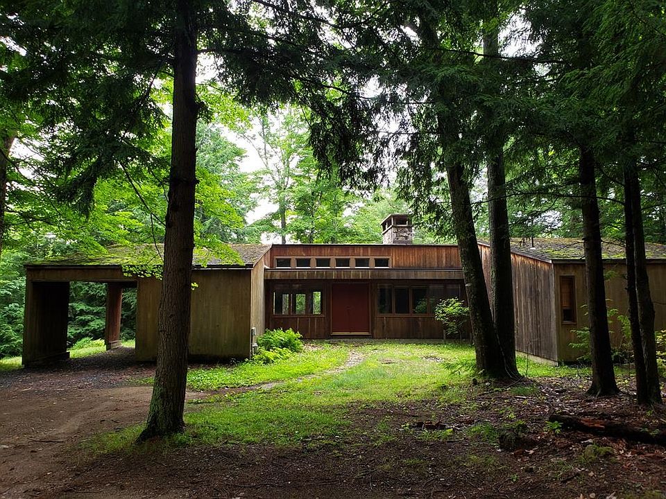 Extraordinarily peaceful, private and quiet site with 37.8 woodland acres, a brook and beautiful views to the west. Three bedrooms, two bath one story home designed in simple, clean 1970's contemporary style. High ceilings, large rooms, walls of windows toward the view, two fireplaces, master bedroom with large bath/dressing room, many, many closets, built-in dressers, oak floors, antique barn-board walls, hand hewn barn rafters, full basement, hot air heating, artesian spring. Being sold "as is", needing a bit of TLC. Views can be extended southwest and northwest.