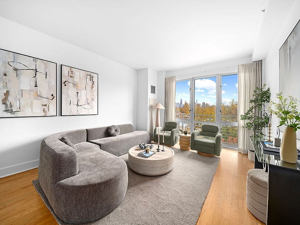 Spanning generous proportions, this residence is flooded with natural light from three exposures and boasts high ceilings, central air, and wide-plank hardwood floors. The north-facing living room opens onto the park’s treetops, offering a serene backdrop and seamless indoor-outdoor living from your private balcony—ideal for morning coffee or sunset cocktails with the Empire State Building in full view.