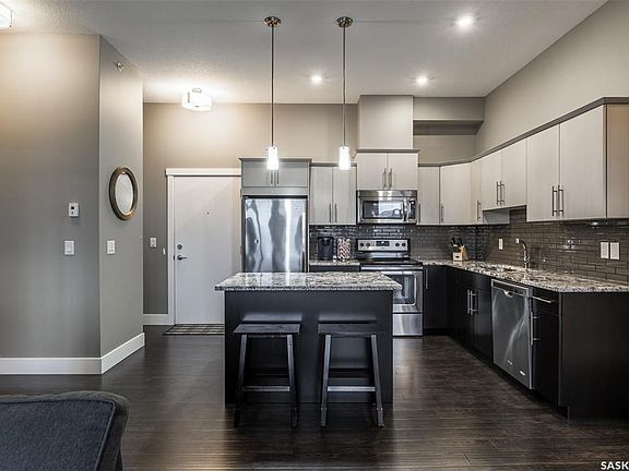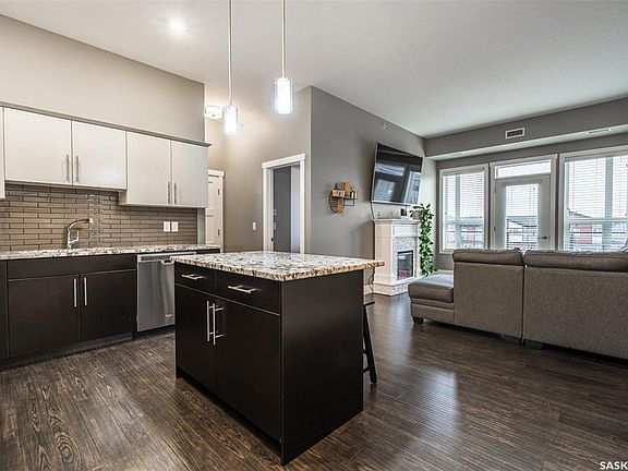 Welcome to unit 307 at 415 Maningas Bend in Saskatoon's Evergreen neighbourhood. The Brixton building is conveniently located near restaurants, green space, shops, gyms, and many other conveniences. This condo is positioned on the top floor and has everything you're looking for! Walking in you enter an open concept kitchen and living room. To your right is your own in-suite laundry with room for a storage and a closet for your coats and shoes. The kitchen has modern stainless steel appliances, granite countertops, and the hood vent is vented out to central exhaust, for when cooking goes sideways on you! The laminate floors are in excellent shape and run throughout the unit creating continuity that makes the space feel even larger than it is. The primary bedroom is spacious enough for a king sized bed and the large windows bring beautiful natural light into the room. Here you have your very own 3 piece bathroom with a shower and vanity topped with granite. There is a second bedroom as well as a 4 piece bathroom with a tub/shower combo and another granite topped vanity. Make sure you step out onto the south facing balcony as it's surprisingly big! Plenty of room for your table and chairs as well as a BBQ and plants - natural gas bbq hook up out here as well. To top it off this unit comes with 2 parking spaces and storage! One parking spot is in the heated underground parkade (#145), one that is an electrified surface stall (#32) and there is a locked storage unit in the parkade (#39). This building also has a guest suite, an amenities room and is pet friendly! Ask your Realtor® for details on what the policy, it's in the listing supplements.